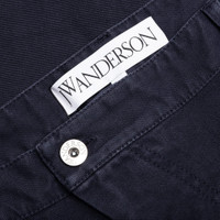 The JW Anderson Twisted Cotton Bermuda Shorts in Navy feature a pique weave cotton fabric, offering a textured and durable feel. Their asymmetric design and seam detailing give a contemporary twist, while an embroidered motif on the front and an applique logo at the rear add branded elements. These shorts come with belt loops, an off-centre button fastening, and various pockets for practicality, maintaining a straight leg and hem for a neat, knee-length finish. - Navy blue cotton - Pique weave, asymmetric design - Embroidered front motif, applique rear logo - Off-centre button fastening - Straight leg, knee-length - Style No: SR0096-PG1476-888