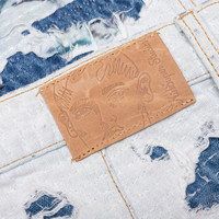 The Boro Stitched Double Knee Pant from KidSuper is composed of cotton and features bold printed artwork. The design is highlighted by the ripped and distressed understitching throughout the piece. The double knee detail gives the pants durability, while the hammer loop adds function. Some finishing touches include the zip fly closure, custom leather patch, and branded hardware. SS25 PT 11 MULT - 100% Cotton - Zip fly closure - Double knee - Printed graphics - Rips and distressing - Custom hardware - Leather patch - Style No: SS25-PT-11