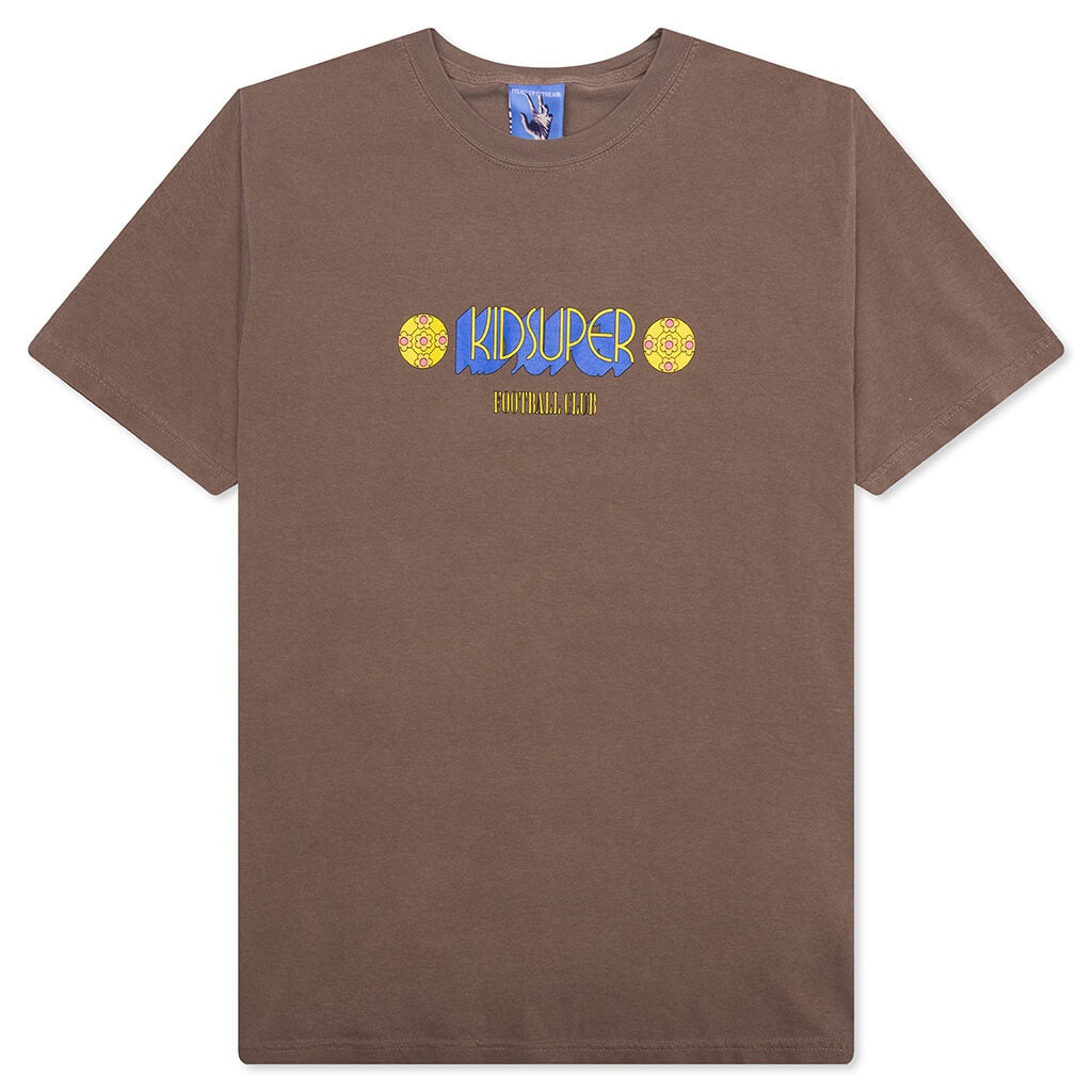 The Football Club Tee from KidSuper is composed of cotton and has a standard fit. The design is highlighted by the screen-printed graphics on the front. The crew neckline and ribbed trims complete the look. SS25 TEE 08 BROW - 100% Cotton - Crew neckline - Short sleeves - Screen-printed graphics - Branded graphics - Style No: SS25-TEE-08