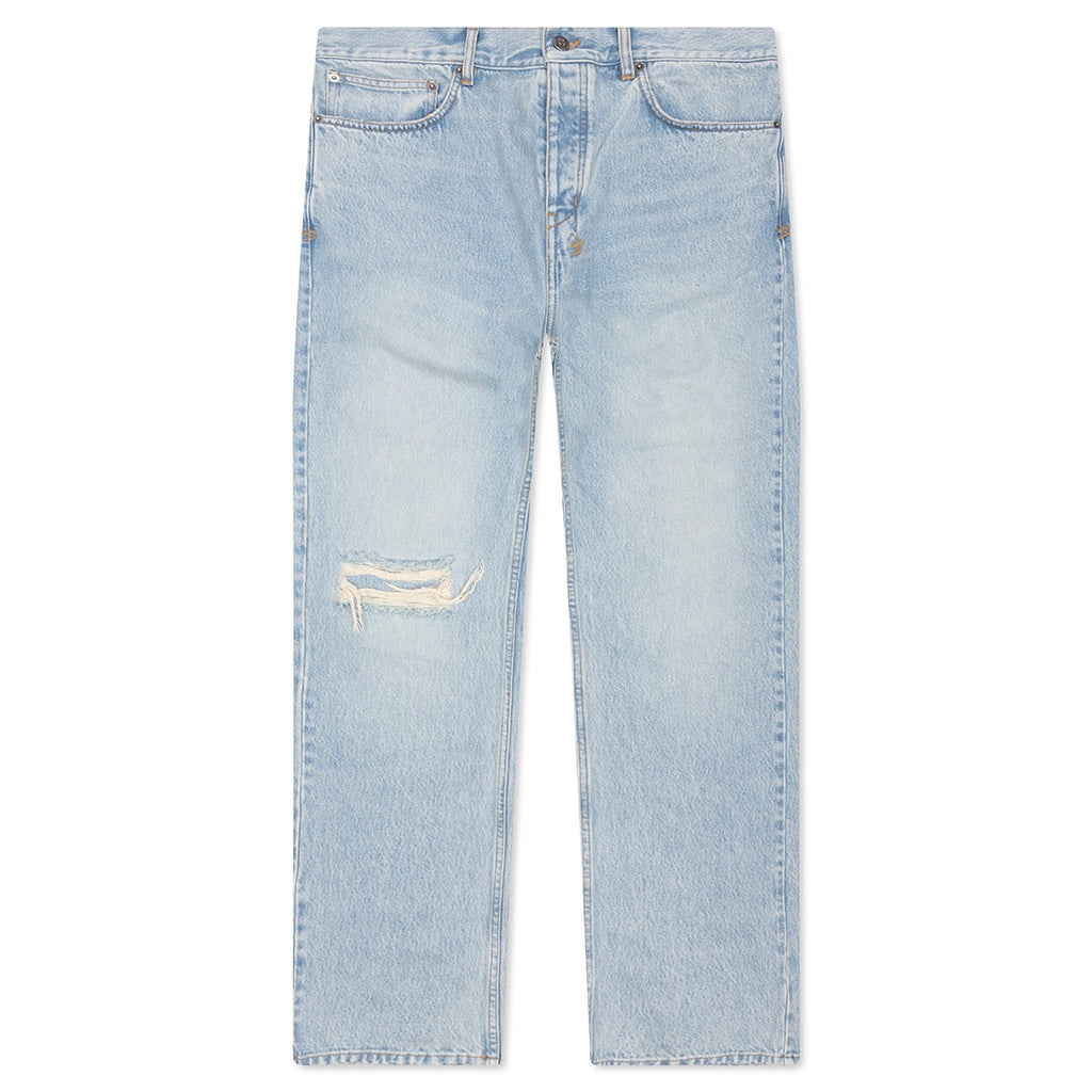 The Ksubi Anti K Paragon Pants offer a mid-rise, straight-leg fit with a regular leg opening for a clean, contemporary silhouette. Crafted from rigid European indigo denim with a heavy, vintage-inspired stone wash, these jeans feature a tonal rip and repair deconstruction on the wearer’s right knee, adding a distinct, worn-in character. Finished with Ksubi’s signature T-box branding, back 4x4 cross embroidery, and ghost patching detailing, they combine elevated style with durability. - 100% Cotton - Straight leg denim jeans - Mid rise - Button closure - Five-pocket construction - Ksubi T-box branding - Back 4x4 cross embroidery - Signature woven pocket tag - Branded hardware - Style No: MSP25DJ002-098