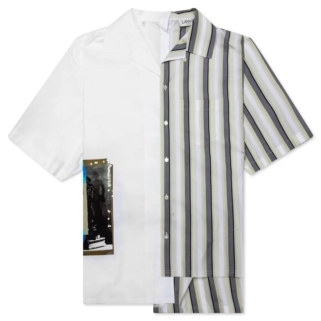 Lanvin introduces the Bigout Short Sleeve in Poplin. Composed of cotton, the silhouette features a spread collar along with a button-down closure. A chest pocket is also placed, while printed imagery marks an impression. The asymmetrical stripes and graphics finish the look. - 100% cotton - Asymmetrical designs - Chest pocket - Printed graphics - Front button closure - Style No: RM-SI0014-5600-P23-01