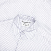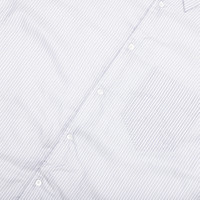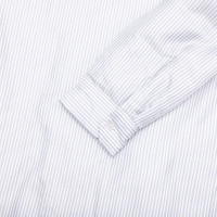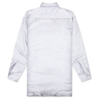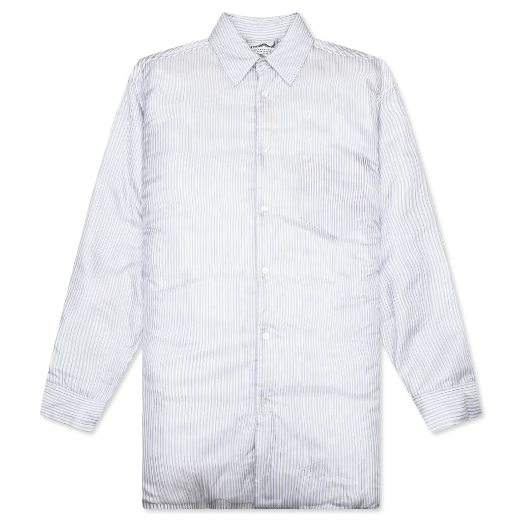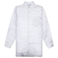 The Padded Stripe L/S Shirt in 'Blue'. This shirt features a spread collar, button closure, and a patch pocket at the chest. It has a shirttail hem, raw edges at the single-button barrel cuffs, white stitching at the back collar, a box pleat at the back yoke, and mother-of-pearl hardware. - Spread collar - Button closure - Patch pocket at chest - Shirttail hem - Raw edges at single-button barrel cuffs - White stitching at back collar - Box pleat at back yoke - Mother-of-pearl hardware - Style No: S50DT0040 M35204 001F