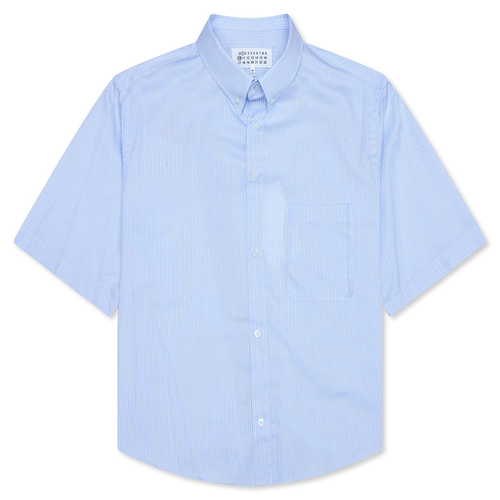 The Short-Sleeved Shirt from Maison Margiela is made with 100% cotton, and has a cropped length fit. Featuring a classic collar with full button closure, and a Decortique chest pocket for a elegant look. Maison Margiela’s signature four stitches appear at the back, opposite of the label. - 100% cotton - Cropped length fit - Decortique chest pocket - Classic collar - Raw hem - Button closure - Four stitches on back - Style No: S50DR0012 M35529 471F
