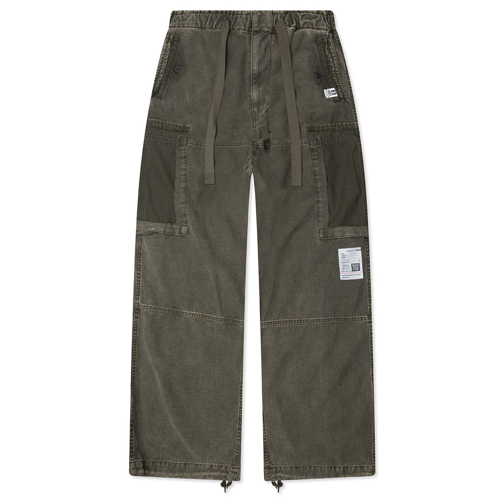 The Cotton Satin Cargo Trousers from Maison Mihara Yasuhiro are crafted for comfort and style. Cut from cotton, the cargo trousers feature a paneled construction and distressed details like tear-off cargo pockets for visual appeal. Functional features include a drawstring waistband, zip-fly with a button closure, three pocket design, and drawstring cuffs. - 100% Cotton - Paneling construction - Drawstring waistband - Zip-fly with button closure - Distressed details - Side-seam pockets - Rear pocket - Drawstring cuffs - Woven brand tags - Style No: J14PT172-DGRN