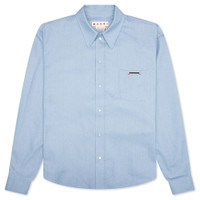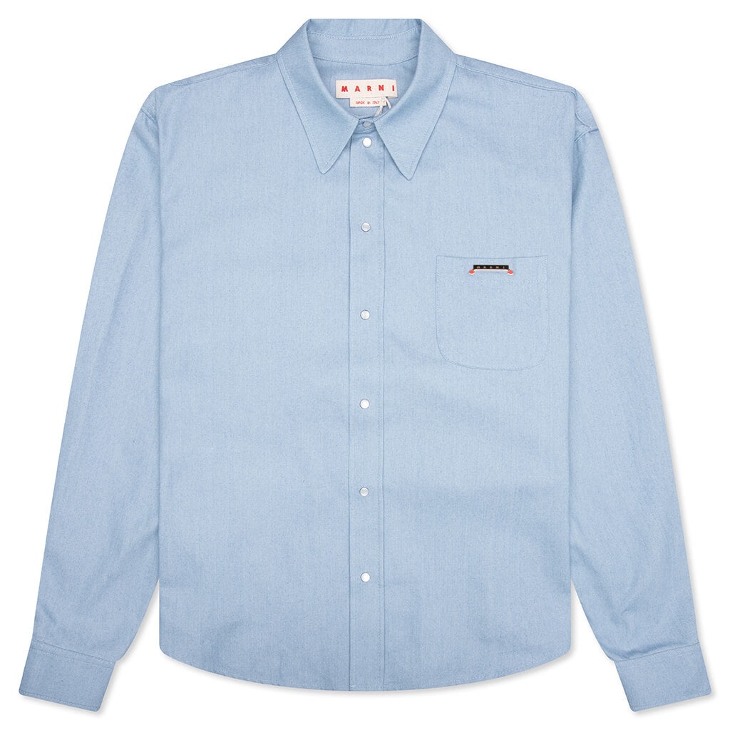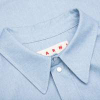The Marni Blue Denim Shirt with Trunakaroo Plaque in iris blue brings a bold, modern twist to a classic design. Made from cotton, it offers a soft, breathable feel. The button-front closure and polo collar add refined details, while the boxy fit ensures comfort with a contemporary silhouette. Finished with an original print, this shirt is a standout piece that adds personality to your wardrobe. - 100% Cotton - Button front closure - Polo collar - Boxy fit - Original print - Style No: CUJU0015A2 UTC476 00B50