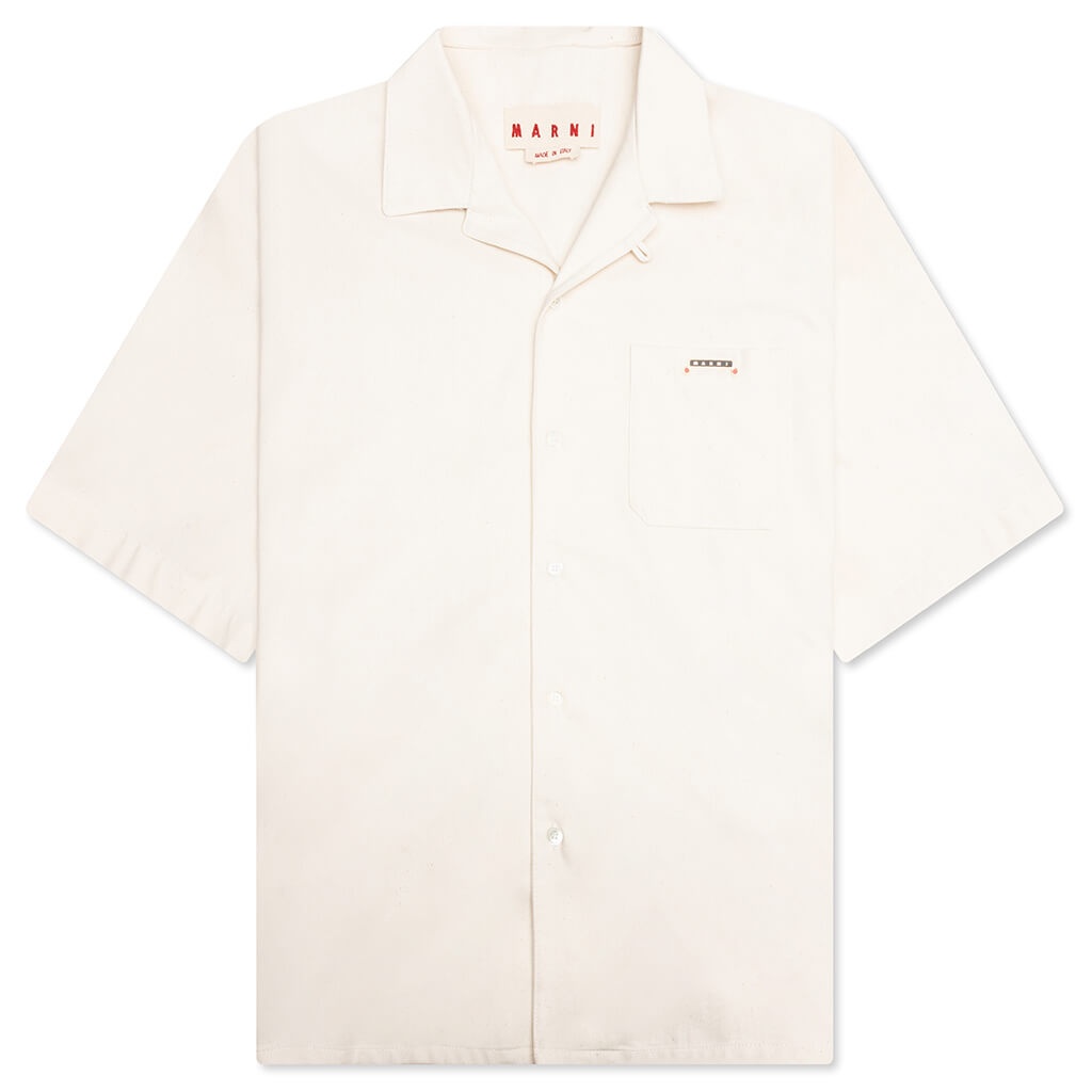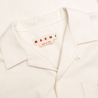 The Marni Cream Denim Short Sleeve Shirt with Trunakaroo Plaque in bone combines a clean, minimalist design with exceptional comfort. Crafted from cotton, this shirt offers breathability and a soft feel against the skin. The button-down design and modern slim fit ensure a sharp, tailored look, while the neutral bone color makes it easy to pair with a variety of styles. - 100% cotton - Button-down design - Slim fit - Neutral bone color for versatility - Style No:CUJU0017A0 UTC476 00W08