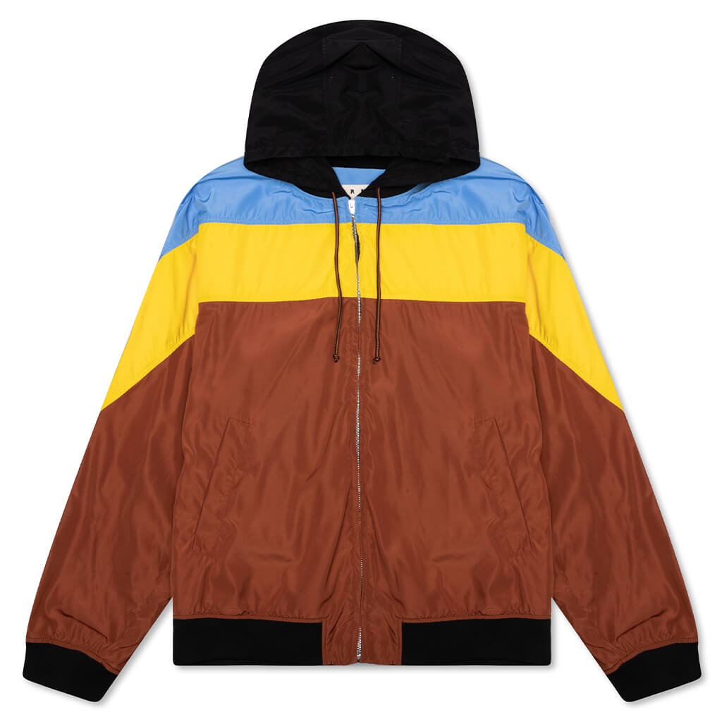 Elevated fashion label Marni introduces its Windbreaker. This technical-inspired silhouette is made for a loose fit and is made from a blend of polyester and cotton. Spotlighting a color blocking design, the full-zip closure provides optimal security. The pull-out hood includes a branded drawstring, while the ribbed collar, cuffs, and hem tie together the rest of the look. - Polyester/cotton blend - Drawstring pull-out hood - Color blocking - Ribbed collar - Ribbed cuffs - Ribbed hem - Style No: JUMU0116LQ TN855 00M38