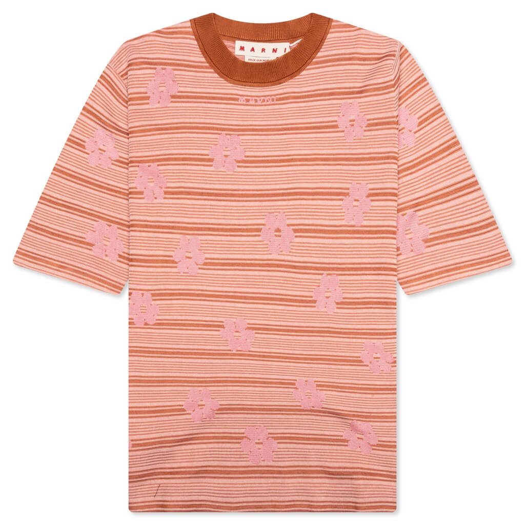 Marni brings together bold colors, standout prints, and playful silhouettes in this Striped Floral T-Shirt. Elevating your casual wardrobe, this piece is crafted from soft cotton knit and features contrasting horizontal stripes with pink floral accents. The Marni logo, positioned just below the neck, adds a subtle touch of the brand’s signature quirky design. - 100% Cotton - Ribbed Crewneck - Embroidered Branding - Style No: GCMG0409EQ UFC324 FLC13