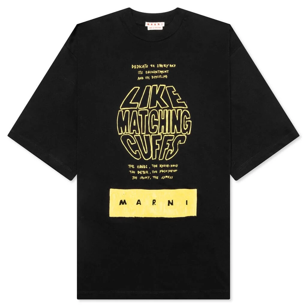 Elevated fashion label Marni’s T-Shirt in Black upgrades any traditional tee. Crafted from cotton in Italy, the tee features a crew neckline with Marni iconography placed on the front that highlights the entirety of the design. A straight hem and branded labeling on the interior of the tee completes the look. - 100% cotton - Made in Italy - Crew neckline - Screen-printed branding - Straight hem - Style No: HUMU0275XP USCV72 CUN99