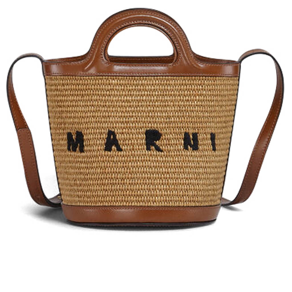 TROPICALIA MINI BUCKET BAG IN BROWN LEATHER AND RAFFIA