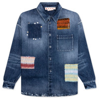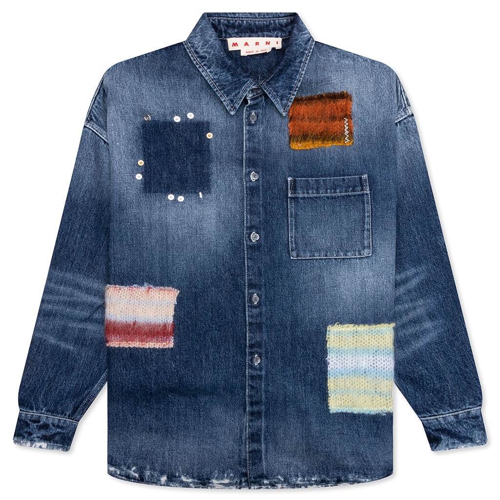 The Marni Shirt in deep blue is crafted from virgin wool woven fabric, offering both comfort and sophistication. The point collar and long sleeves with buttoned cuffs create a classic design, while the chest patch pocket adds a practical touch. The shirttail hem and button-front closure complete the look, making it a versatile piece that can easily transition from casual to more refined settings. - 100% Virgin Wool Woven - Point collar - Long sleeves, buttoned cuffs - Chest patch pocket - Shirttail hem - Button-front closure - Style No: CUJU0061LX USCX01 00B90