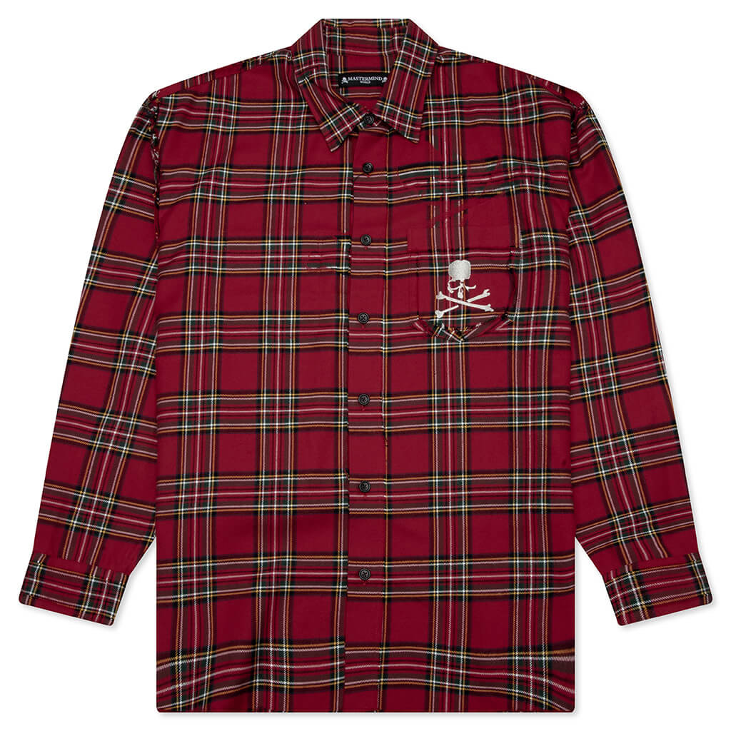 Introducing the Plaid Shirt from Mastermind World. Crafted from soft cotton, the button-up is designed to have an oversized fit and decorated in an all-over plaid pattern. Classic details include a collar, front button closure, and chest pocket. Distressed details give the piece a timeworn feel, while embroidered graphics adds standout branding. - 100% Cotton - Oversized fit - Distressed details - Classic collar - Front button closure - Chest pocket - Embroidered graphics - Branded straps at hem - Style No: MW25E15-SH007-026