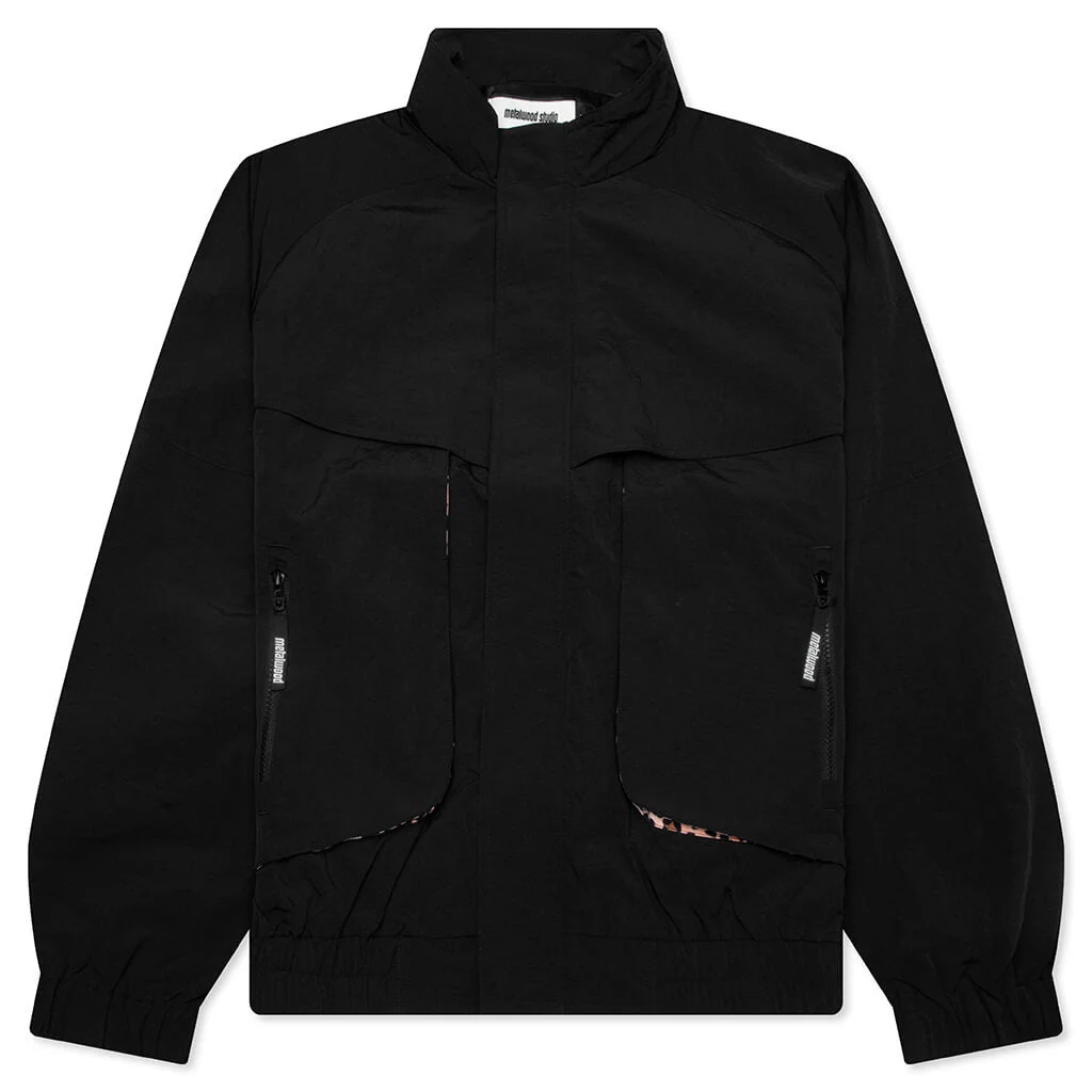 The Metalwood Studio Bomber Jacket is built with a nylon shell and a smooth polyester-viscose lining. A standing collar and concealed full-zip closure maintain a clean, streamlined look, while an elastic waistband and cuffs ensure a secure fit. Underneath the zip pockets, contrast cheetah-print fabric decorate the pocket panels. Finished with embroidered branding at the back neck. - Shell: 100% Nylon - Lining: 52% Polyester, 48% Viscose - Standing collar - Concealed full-zip closure - Zip pockets - Embroidered branding - Elastic cuffs and waistband - Style No: 25FW-05-109-BLK