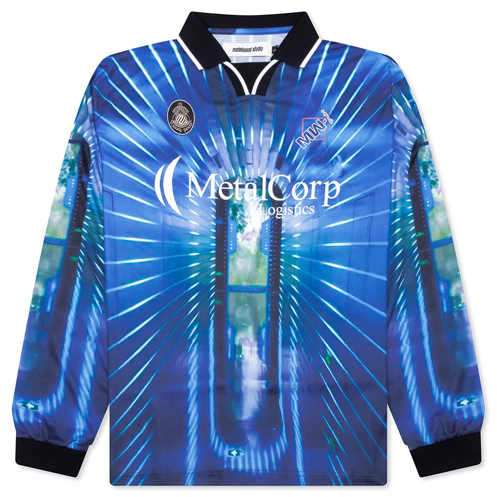 The KTV L/S Jersey reimagines athletic wear with Metalwood Studio's signature personality. Crafted from polyester, the jersey ensures a light and breathable fit. Adorned in an all-over print, the piece is complemented with screen-printed graphics and an embroidered patch. Ribbed trims round out the design. - 100% Polyester - All-over print - Johnny collar - Screen-printed graphics - Embroidered patch - Ribbed trims - Style No: 25FW-04-105-BLU
