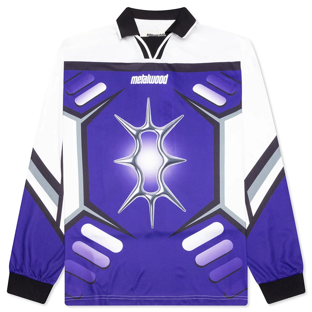 The X-Games L/S Jersey from Metalwood Studio makes a statement in any collection. Composed of polyester, this garment is made from a waffle fabric for comfortability. The look is highlighted by the all-over digital print that's motorsport-inspired. The spread collar and ribbed elastic trims complete the look. - 100% Polyester - Motorsport-inspired - Ribbed trims - All-over print - Spread collar - Waffle fabric - Style No: MWS25-04-13-WHT-BLP