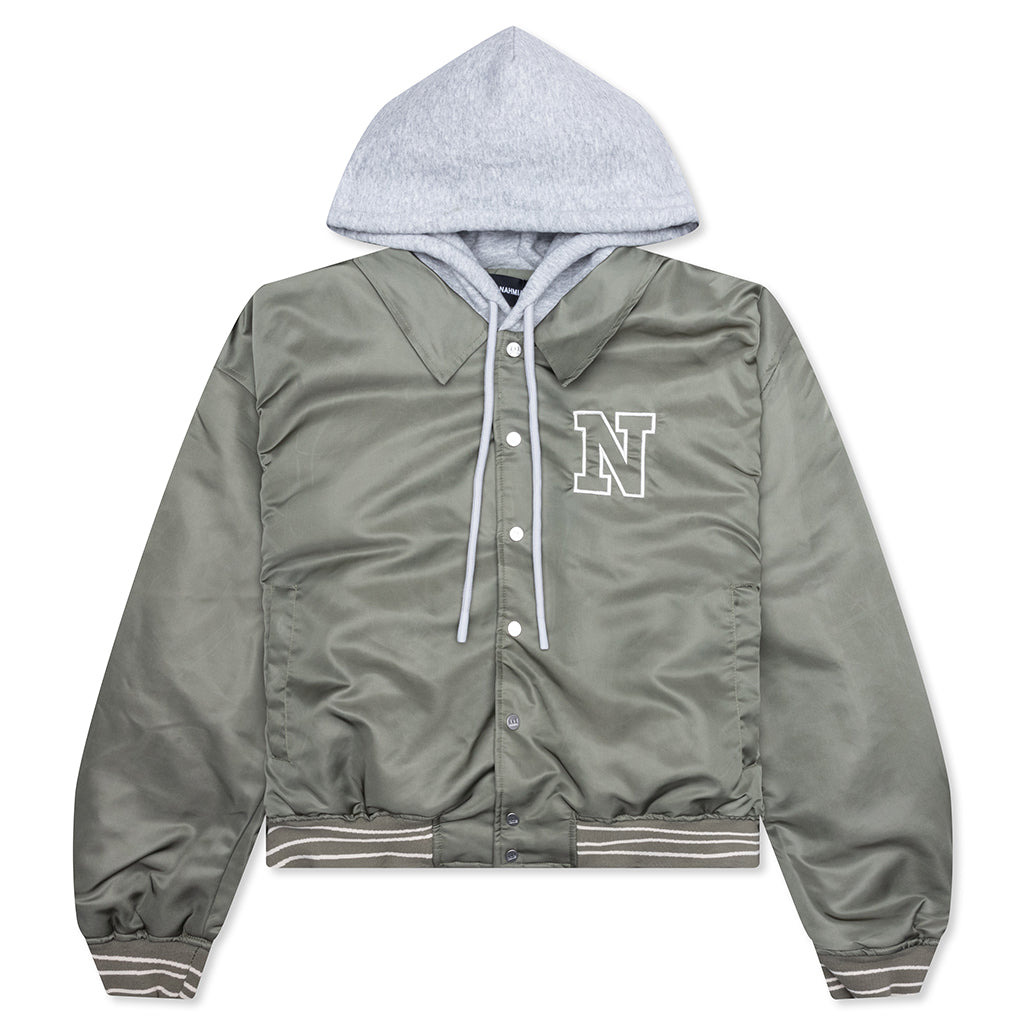 The Nylon Hooded Bomber from Nahmias is constructed from nylon and has a soft poly-stretch lining. The piece has a light fill to give it that classic bomber jacket silhouette with a sporty touch from the cotton fleece hood. Featuring a zip front with snap closures, welt pockets, and ribbed trims that showcase the signature Ollie stripes. Finished with a 'N' patch at the chest for the final touch. - 100% Nylon - Poly-Stretch lining - Boxy fit - Cotton fleece hood with drawstrings - Zip front with snap closures - Ribbed waistband and cuffs - 'N' patch - Welt pockets - Style No: W91-J54G14-308
