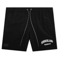 Classic swim trunks with a thigh-length structure and an elastic waistband. A pull-on fit, the Summerland Nahmias Swim Trunks has an adjustable drawstring with two-pocket styling and a 'Summerland' screen-printed graphic. M1-R2G82-001-BLK - Nahmias drawstring - Pockets - True to size - Style No: M1-R2G82-001-BLK