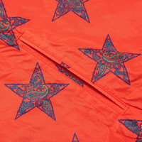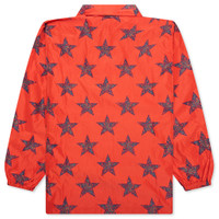 The Coach Jacket from Needles is the brand's latest release. Composed of polyester, this wind-breaker style silhouette features a purple star print atop the red base. Technical details include a full button closure, a classic collar, and comfortable hand pockets. The look is completed with elastic cuffs and a drawstring hem. - 100% Polyester - Button closure - Side pockets - Classic collar - Star print - Elastic cuffs - Drawstring waistband - Style No: PU182-A