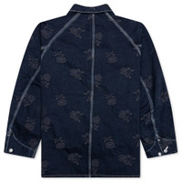 Needles makes a statement with the Coverall Demin in Indigo. This jacket is composed of 10oz non-stretch denim and features a Jacquard floral print all over. Technical details include the spread collar, full button closure, and adjustable button barrel cuffs. The silhouette is completed with a flap pocket, patch pockets, and contrasting stitching. - 100% 10oz denim - Jacquard print - Spread collar - Button cuffs - Flap pocket and patch pockets - Engraved hardware - Pen slots on pocket - Contrast stitching - Style No: PU199-A