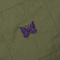 The Needles D.N. Coverall Back Sateen makes an impression on any apparel collection. The cotton-cut silhouette features a button closure along with front pockets. The embroidered papillon graphic makes an impression, while the pointed collar wraps up the design. MR220 OLIV - 100% cotton - Button closure - Front pockets - Embroidered graphic - Style No: MR220-OLI