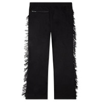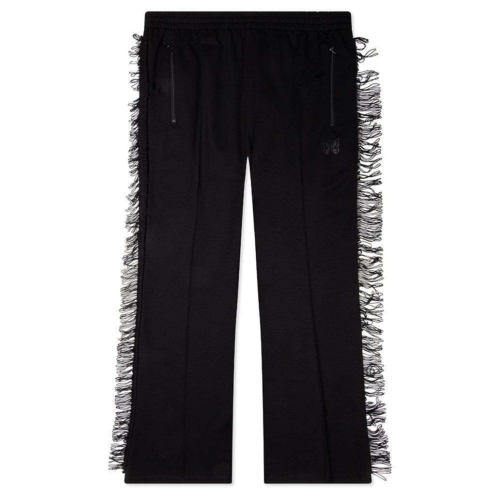 The Needles Rayon Jersey Fringe Boot-Cut Track Pant makes an elevated statement in any apparel collection, crafted from a fluid blend of Rayon, Nylon, and Polyurethane for a soft, flexible fit. Designed with a boot-cut silhouette, this standout piece features fringe detailing along each leg, adding dynamic movement to its sleek profile. Zippered side pockets with mesh interiors and a zippered back pocket offer practical storage, while the elasticized waistband with drawstring ensures all-day comfort. Finished with Needles' embroidered logo below the left pocket, this Japan-made style fuses sport, fashion, and edge. QV335 C BLAC - Body: 69% Rayon, 29% Nylon, 2% Polyurethane - Fringe: 100% Rayon - Embroidered logo below left pocket - Boot-cut fit with fringe detailing - Zippered side pockets with mesh interior - Zippered back pocket - Elasticized waistband with drawstring - Made in Japan - Style No: QV335-C