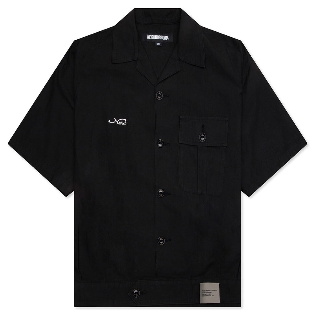 Neighborhood introduces the Belted Officer S/S Shirt. Constructed from a blend of 80% cotton and 20% linen, this woven shirt features a boxy fit for a relaxed, utilitarian look. The embroidered logo on the chest and the flap pocket with a button add functional details, while the clip tag on the seam and brand label at the left hem finish off the design. - 80% Cotton, 20% Linen - Boxy fit - Embroidered logo on chest - Flap pocket with button on chest - Clip tag on side seam - Brand label at left hem - Open collar - Style No: 251AQNH-SHM07-BLK