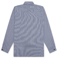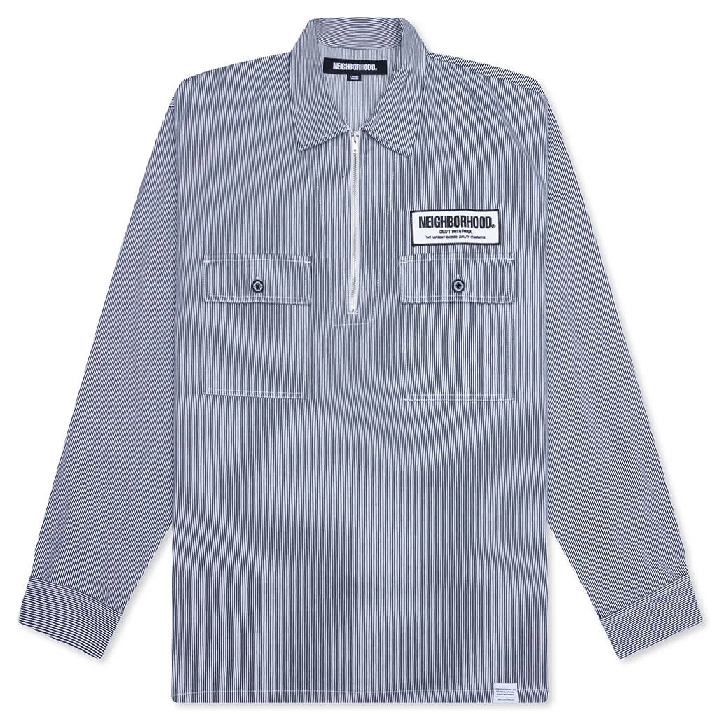 Neighborhood presents clean style with the Classic Work L/S Pullover Shirt. Constructed from cotton, the piece is adorned in a hickory stripe pattern. The point collar and half-zip closure provide a contemporary twist, while two chest pockets and a pen holder offer practical storage. Signature branded details include a logo patch, woven tag, and custom buttons. - 100% Cotton - Point collar - Half-zip closure - Chest pockets - Pen holder - Logo patch - Woven brand tag - Custom buttons - Style No: 252TSNH-SHM11-IND