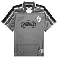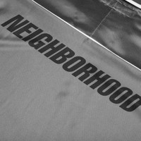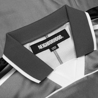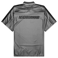 Neighborhood introduces the Game S/S Shirt. Cut from 100% polyester, this shirt provides moisture absorption and quick drying properties, making it perfect for sports or everyday activities. Inspired by soccer polo designs, it features a johnny collar and striped piping details along the shoulders. Finished with screen-printed graphics, embroidered patches, and a name tag for distinctive branding. - 100% Polyester - Loose fit - Johnny collar - Screen-printed graphics - Embroidered patches - Branded tag - Style No: 251FPNH-CSM16-GRY