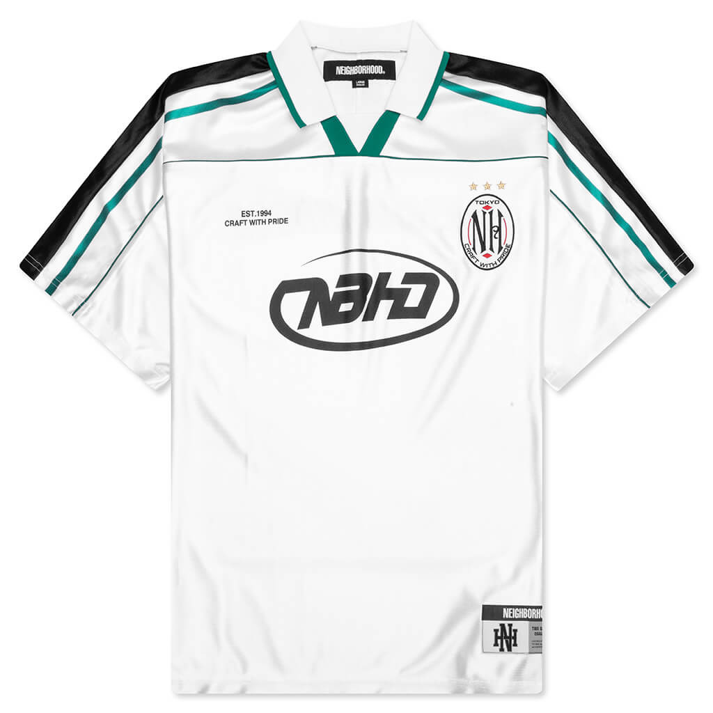 Neighborhood introduces the Game S/S Shirt. Cut from 100% polyester, this shirt provides moisture absorption and quick drying properties, making it perfect for sports or everyday activities. Inspired by soccer polo designs, it features a johnny collar and striped piping details along the shoulders. Finished with screen-printed graphics, embroidered patches, and a name tag for distinctive branding. - 100% Polyester - Loose fit - Johnny collar - Screen-printed graphics - Embroidered patches - Branded tag - Style No: 251FPNH-CSM16-WHT