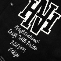 The Neighborhood Stadium Jacket is a must-have outerwear streetwear item. The design is composed of wool and nylon and is highlighted by the array of patchwork designs and embroidery. The design features a custom-quilted jacquard lining, snap button front, double welt pockets, and ribbed detailing at the cuffs and hem for a finished design. - Wool/nylon blend - Embossed cow leather - Jacquard lining - Snap button front closure - Double welt pockets - Ribbed trims - Style No: 232SZNH-JKM03-BLK