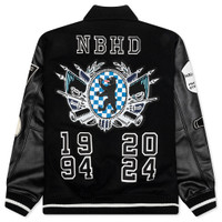 The Stadium Jacket in Black/White combines timeless varsity style with premium materials. Featuring a melton wool body with cow leather sleeves, this jacket offers durability and a luxurious finish. Designed with a relaxed, slightly cropped fit, it includes custom woven patches, branded snap closures, and leather-trim welt hand pockets. Striped ribbing at the cuffs and hem adds a classic touch, while an internal chest pocket and woven label at the hem complete the look. - Body: 90% wool, 10% polyester - Sleeves: 100% cow leather - Relaxed, slightly cropped fit - Melton wool body fabric - Custom woven patches - Custom branded snap closure - Leather trim welt hand pockets - Internal chest pocket - Striped ribbing at cuffsr and hem - Woven label at hem - Style No: 242SZNH-JKM07-BK-WH