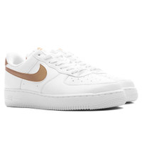 The Nike Air Force 1 ‘07 in White/Metallic Gold is a must-have sneaker for any collection. This new variation features stitched leather overlays within the upper, while the Nike Air cushioning adds optimal comfort with each step. The padded low-cut collar adds additional comfort, while the perforated toe box adds further breathability. The foam midsole and full-length rubber outsole protect the look. - Stitched leather upper - Padded/low-cut collar - Perforated toe box - Foam midsole - Rubber outsole - All sizes are listed in U.S. Women's sizing unless stated otherwise - Style No: DC9486-114