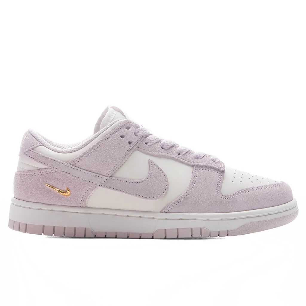 The Nike Women's Dunk Low SE in Sail/Pearl Pink/White/Metallic Gold brings a fresh twist to a classic silhouette. Designed with a leather upper and suede overlays, a miniature gold Swoosh can be found on the outer side panel. Featuring a nylon tongue, padded collar for extra cushioning, and a perforated toe box for enhanced breathability. Embroidered branding and a tongue label add subtle details, while the rubber outsole completes the shoe with traction and grip. - Leather upper - Suede overlays - Nylon tongue - Padded collar - Embroidered branding - Tongue label - Miniature gold Swoosh - Perforated toe box - Rubber outsole - All sizes are listed in U.S. Women’s sizing unless stated otherwise - Style No: IO4244-100