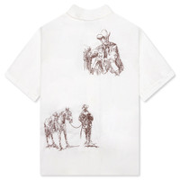 One of These Days, known for its Western-inspired apparel, introduces the Remember Me Camp Shirt. Composed of linen, this garment is ideal for warmer months with its lightweight construction. This design features finely embroidered graphics on the front and back, and a pick stitch detail on the sleeve and collar add further detail. The button-down closure and the camp collar complete the look. 02C 06 006 - 100% Linen - Camp collar - Button closure - Mother-of-pearl buttons - Chest pocket - Embroidered graphics - Pick stitch detail - Curved hem - Style No: 02C-06-006-IVY