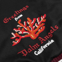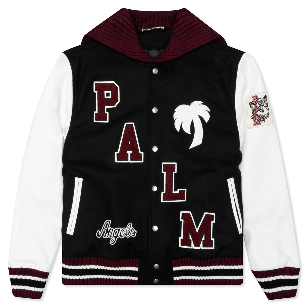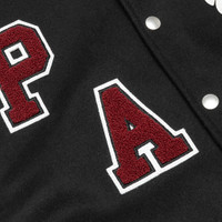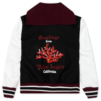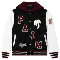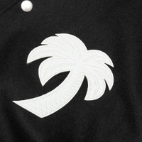 Take on a collegiate approach with the Palm Angels Marine Collar Varsity Jacket. Composed of a blend of virgin wool and leather, the design spotlights a front press-stud fastening with striped trims. A logo patch is placed at the front along with patch branding and graphics. Front welt pockets are placed, completing the look. - Virgin wool/leather blend - Front press-stud fastening - Logo patchwork - Front welt pockets - Striped trims - Style No: PMEA212S22FAB0014625