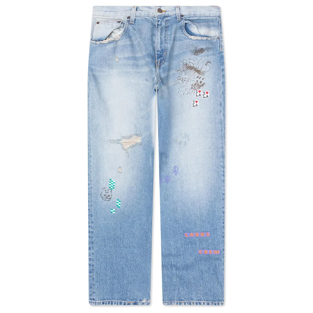 The Paly Hollywood Lucky Jeans reinterpret classic denim through an artful lens. Constructed from cotton, they feature a straight fit with a slightly tapered leg. The vintage wash process, distressed details, and butt repairs add an authentically worn-in feel. Screen-printed graphics and square embroidery decorates the jeans with fun personality. THIS PRODUCT DOES NOT QUALIFY FOR HALLOWEEN SALE. - 100% Cotton - Straight fit, slightly tapered leg - Zip-fly with button closure - 5-pocket design - Screen-printed graphics - Square embroidery - Vintage wash process - Distressed details and butt repairs - Style No: 5U003Q3009-LDM
