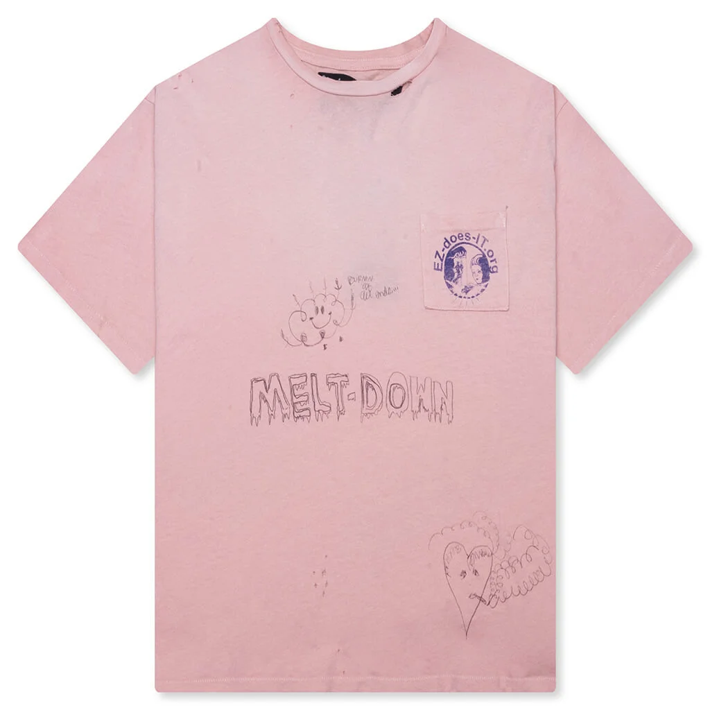Crafted from 100% cotton Japanese jersey, the Rehab Romance Pocket Tee from Paly Hollywood delivers a distinct blend of texture, wear, and visual storytelling. Featuring a boxy, cropped fit, it's treated with a heavy enzyme wash and sun-faded treatment for a naturally aged look. Hand distressing adds character, while screen-printed graphics bring a layered, expressive finish. THIS PRODUCT DOES NOT QUALIFY FOR HALLOWEEN SALE. - 100% Cotton - Vintage textured jersey fabric - Boxy, cropped fit - Crew neckline - Chest pocket - Screen-printed graphics - Heavy enzyme wash and sun-faded treatment - Hand distressing details - Style No: 2U005Q3009-PNK