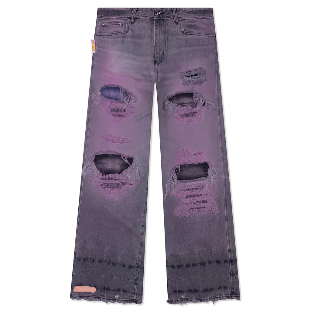 The Rich Kid Jeans from PDF Channel offer a raw, expressive take on classic denim. Cut from cotton with a wide-leg silhouette, the jeans are distressed and finished with a washed and pink spray treatment. Signature PDF Channel details include the back pocket embroidery, custom hardware, and rubber bandaid patches at the hem and waistband. Finished with a classic zip-fly and five-pocket design. - 100% Cotton - Wide-leg - Zip-fly - 5-pocket design - Embroidered graphic - Snap buttons at cuffs - Custom hardware - Rubber bandaid patches - Pink spray treatment - Distressed details - Woven label tag - Style No: DFM03032DF119WHBLK