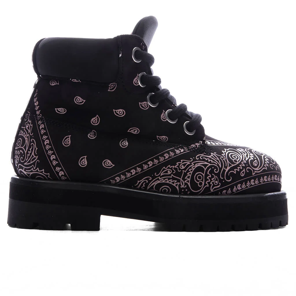PDF Channel presents the Strada Low Bandana Low Bandana the latest addition to its footwear collection. Made with a cow leather upper while including a neoprene tongue and padded collar for clean look. Designed as a high top boot, featuring internal sock construction, thick laces, bandana printing, and PDF Channel branding. A thick midsole and patterned rubber outsole finish off the look while offering traction and stability. THIS ITEM RUNS ABOUT A FULL SIZE LARGE, WE RECOMMEND SIZING DOWN - 100% Cow leather upper - Neoprene padded collar - Neoprene tongue - Internal sock construction - Thick laces - Bandana printing - PDF Channel branding - Thick midsole - Rubber outsole - All sizes listed in European Men's sizes unless stated otherwise - Style No: DFM45012S0010PX-BLACK