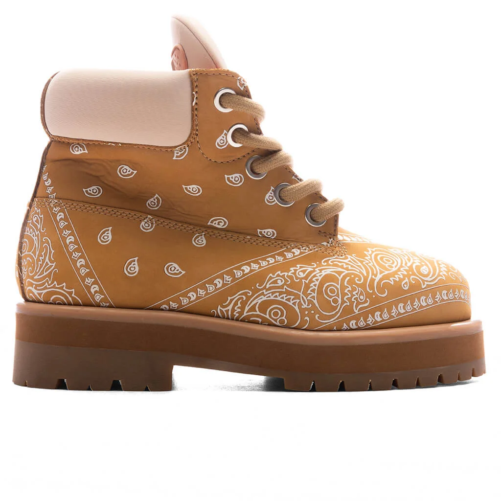 PDF Channel presents the Strada Low Bandana Low Bandana the latest addition to its footwear collection. Made with a cow leather upper while including a neoprene tongue and padded collar for clean look. Designed as a high top boot, featuring internal sock construction, thick laces, bandana printing, and PDF Channel branding. A thick midsole and patterned rubber outsole finish off the look while offering traction and stability. THIS ITEM RUNS ABOUT A FULL SIZE LARGE, WE RECOMMEND SIZING DOWN - 100% Cow leather upper - Neoprene padded collar - Neoprene tongue - Internal sock construction - Thick laces - Bandana printing - PDF Channel branding - Thick midsole - Rubber outsole - All sizes listed in European Men's sizes unless stated otherwise - Style No: DFM45012S0010PX-YELL