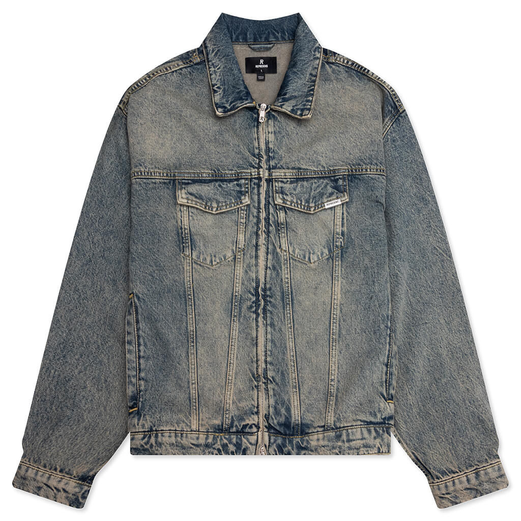 Constructed from 100% heavyweight cotton denim, the Represent R4 Denim Jacket delivers a vintage-inspired look with a rich, worn-in texture while having top-quality feel. Designed with a slightly oversized fit, the jacket features signature touches throughout: a double RiRi branded zip closure, and a V-detailed yoke on the back that adds a subtle structural edge. The front is defined by panel detailing, chest pockets, and side welt pockets. The signature Represent metal bar branding is placed on the chest pocket. MLM619 25 - 100% Cotton - Slightly oversized fit - Heavy wash - Double RiRi branded zip pull - V-detailed back yoke - Front panel detailing - Side welt pockets - Chest pockets with popper fastenings - Cobrax popper adjusters on hem & cuffs - Represent metal bar - Style No: MLM619-25