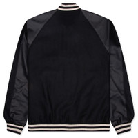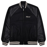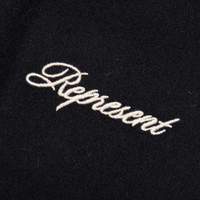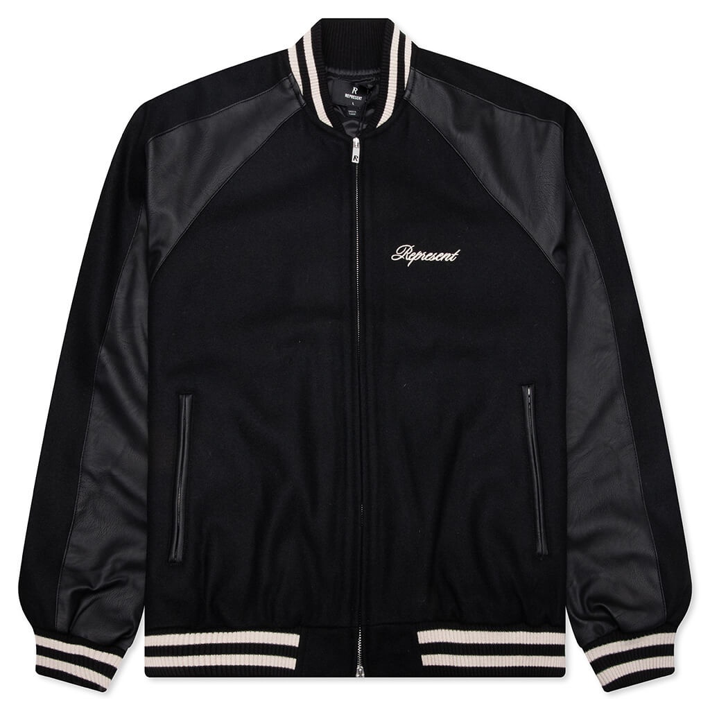 The Raglan Varsity Jacket from Represent has a slightly oversized fit, with raglan sleeves featuring a three-panel design, two PU, and one self fabric. It showcases tonal Represent script embroidery to the chest, with zip hand pockets. The jacket is finished with a rib to the collar, cuff and hem. MLM1803 001 - 80% Wool/20% Polyamide - 100% PU sleeve - 100% Polyester lining - Zip closure - Embroidered branding - Striped trims - Hand pockets - Style No: MLM1803-001