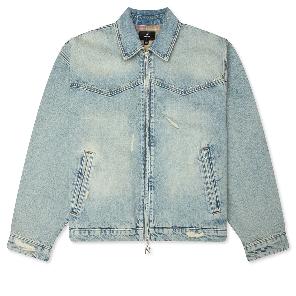 Represent is a British label known for its elevated streetwear that merges modern aesthetics with a rugged, rock-inspired attitude. The Represent x Gun N' Roses Denim Jacket is a denim jacket made from 100% cotton. Designed with a boxy fit, this jacket showcases a co-branded graphic embossed into the denim to honor the band. - Brand: Represent - Product Name: Represent x Guns N' Roses Denim Jacket - Category: Denim Jacket - Color: Light Vintage Blue - Main Material: 100% Cotton - Fit: Boxy fit - Closure: Zip-up front - Graphics: Co-branded embossed graphic, flat studded embellishments, leather patch - Collar: Classic collar - Construction Notes: Plaid lining, front yoke, front pockets, branded hardware, subtle distressing, buttoned cuffs, adjustable waist tabs - Style Code: MLM100763-08