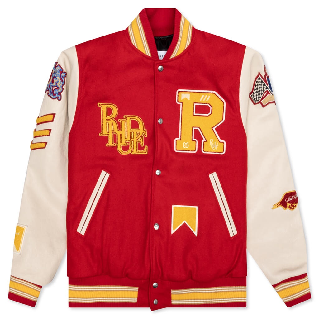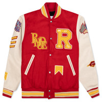 Rhude introduces a collegiate-inspired design in the Bull Market Varsity Jacket. Taking on a blend of leather, polyester, wool, and cotton, the jacket features a cropped hem and is secured by a custom Rhude snap closure. Hand pockets are seen, while the branded chenille patchwork at the chest, arms, and rear includes an additional embroidered design. The ribbed neckline, waist, and cuffs finish up the rest of the silhouette. FW22JA106090451045 - Leather/polyester/wool/cotton blend - Snap closure - Hand pockets - Chenille patchwork - Ribbed trims - Style No: RHFW22JA106090451045
