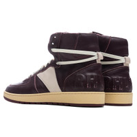 Rhude’s vintage and worn-in approach to footwear is present in the Rhude Recess Hi. The high-top sneaker features a leather upper colorblocked throughout the exterior. Distressed and fading details are seen throughout the design, while perforated holes make an appearance at the toe-box. An off-white lace-up closure is placed, while the tongue receives a padded material for additional comfort. A suede logo at the heel and rubber midsole and outsole complete the look. FINAL SALE ITEM. NOT ELIGIBLE FOR RETURNS/CANCELLATIONS. - Leather upper - Off-white lace-up closure - High-top design - Distressed detailing - Faded detailing - Padded tongue - Suede logo - Rubber midsole - Treaded rubber outsole - All sizes are listed in U.S. Men’s sizing unless stated otherwise - Style No: RHFW21FO10039127