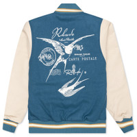Add a new outerwear silhouette to your rotation with the Rhude Sparrow Varsity Jacket. Composed of leather, cotton, and wool, the jacket takes on a cropped hem and a custom snap closure. Chenille patchwork is seen at the chest, with additional embroidered branding and imagery seen throughout the front and rear. Hand pockets are placed, while the ribbed trims finish up the remainder of the silhouette. FW22JA386090481048 - Leather/cotton/wool blend - Snap closure - Chenille patchwork - Embroidered branding - Embroidered graphics - Hand pockets - Ribbed trims - Style No: RHFW22JA386090481048
