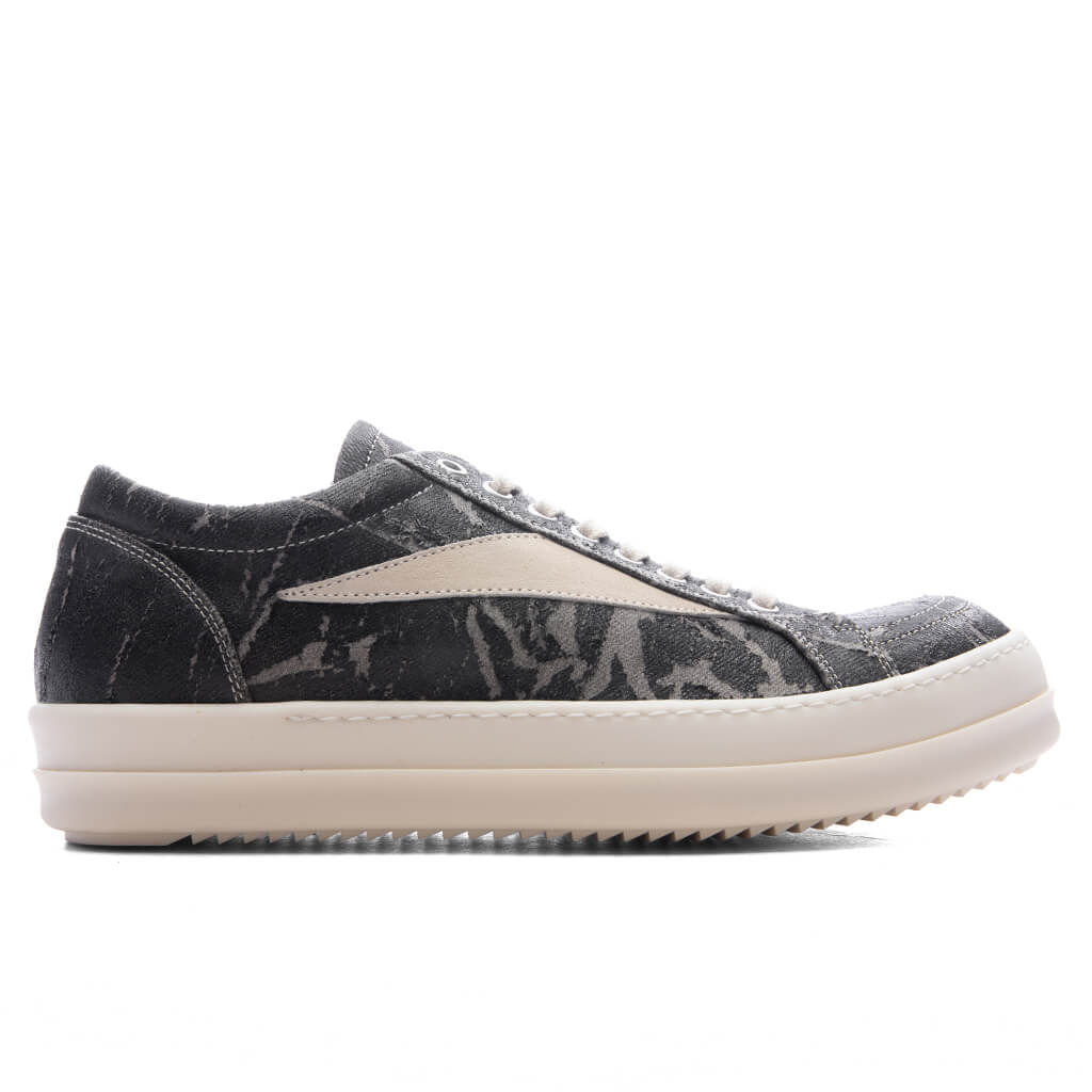 The Rick Owens DRKSHDW Vintage Sneaks reinterpret a classic court silhouette through a distinct premium lens. Crafted with a black distressed canvas upper, the design features contrast stitching, a leather side stripe, metal eyelets and a marbled effect all over for a utilitarian edge. A leather footbed and thick Milk rubber midsole-outsole combination complete the look with Rick Owens’ signature elevated structure. - Distressed Canvas upper - Marbled treatment - Thick rubber midsole-outsole - Leather side stripe - Leather footbed - Contrast stitching - Metal eyelets - All sizes listed in European Men's sizes unless stated otherwise - Style no: DU02E7803-DWFLVS-5911
