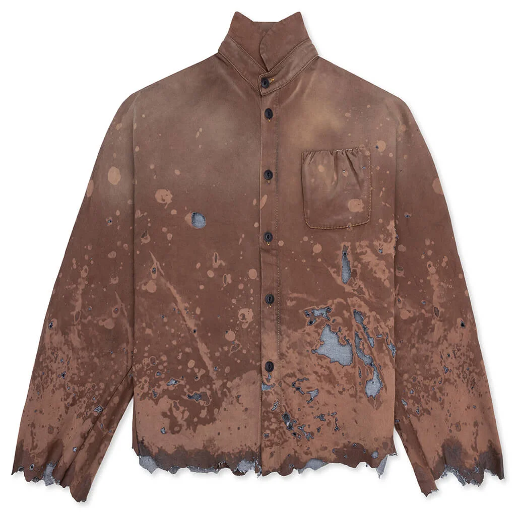 RIVINGTON roi Rebis elevates classic shirting with the Meta-Braxas Shirt. Constructed from cotton, it is designed to have a casual, yet structured silhouette that is perfect for layering or wearing solo. The piece is heavily distressed with raw cut hems, tears, and discoloration for RIVINGTON roi Rebis edge. Other details include a folded collar, button front, and chest pocket. - 100% Cotton - Folded collar - Button-up front - Chest pocket - Distressed details - Raw cut hem - Style No: MTBX-SI82-RUST