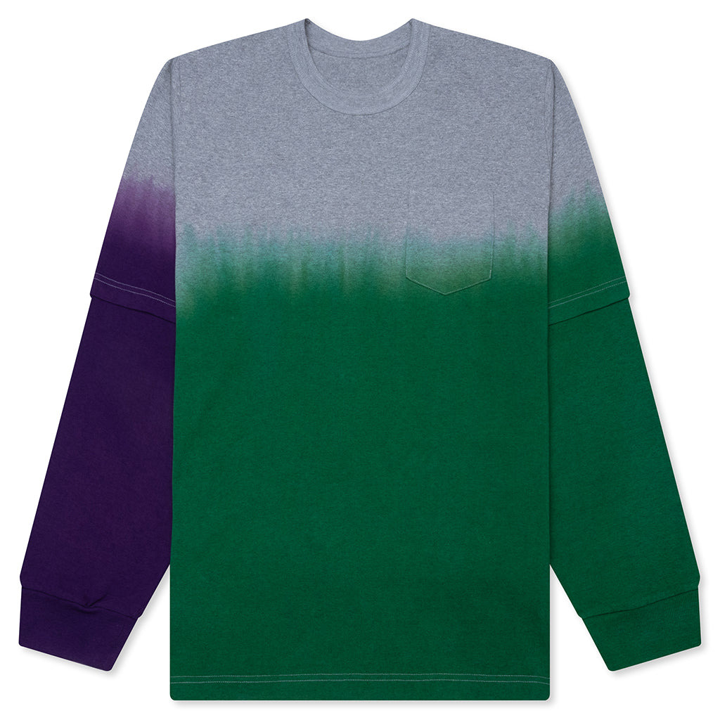 Introducing the Garment Dye Cotton Jersey L/S T-Shirt from Sacai. Cut from premium cotton, this tee is garment dyed to create subtle tonal variations for the ombre design. A pocket sits at the chest, while a crew neckline and ribbed trims round out the design. - 100% Cotton - Garment dyed - Layered sleeve design - Crew neckline - Ribbed trims - Chest pocket - Style No: 25-03799M-551
