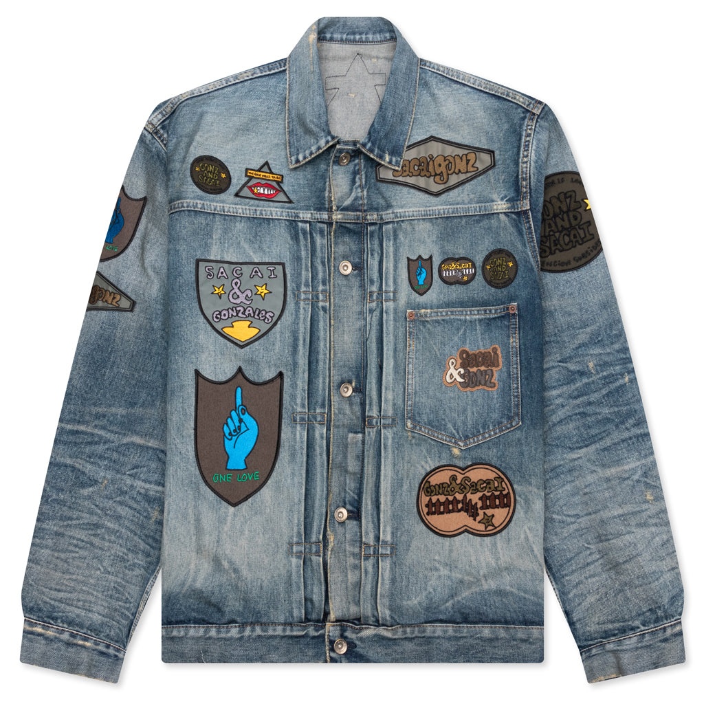 The Sacai Gonz Denim Jacket in Light Blue is crafted from cotton and made in Japan, offering a premium construction. Featuring a front button closure, it includes side seam pockets and a chest pocket for practicality. The jacket is adorned with patched details throughout and lightly distressed accents, giving it a unique, worn-in look. Buttoned cuffs complete this standout piece. - 100% cotton - Made in Japan - Front button closure - Side seam pocket and chest pocket - Buttoned cuffs - Patched detail throughout - Lightly distressed detail - Style No: 24-03525M-451